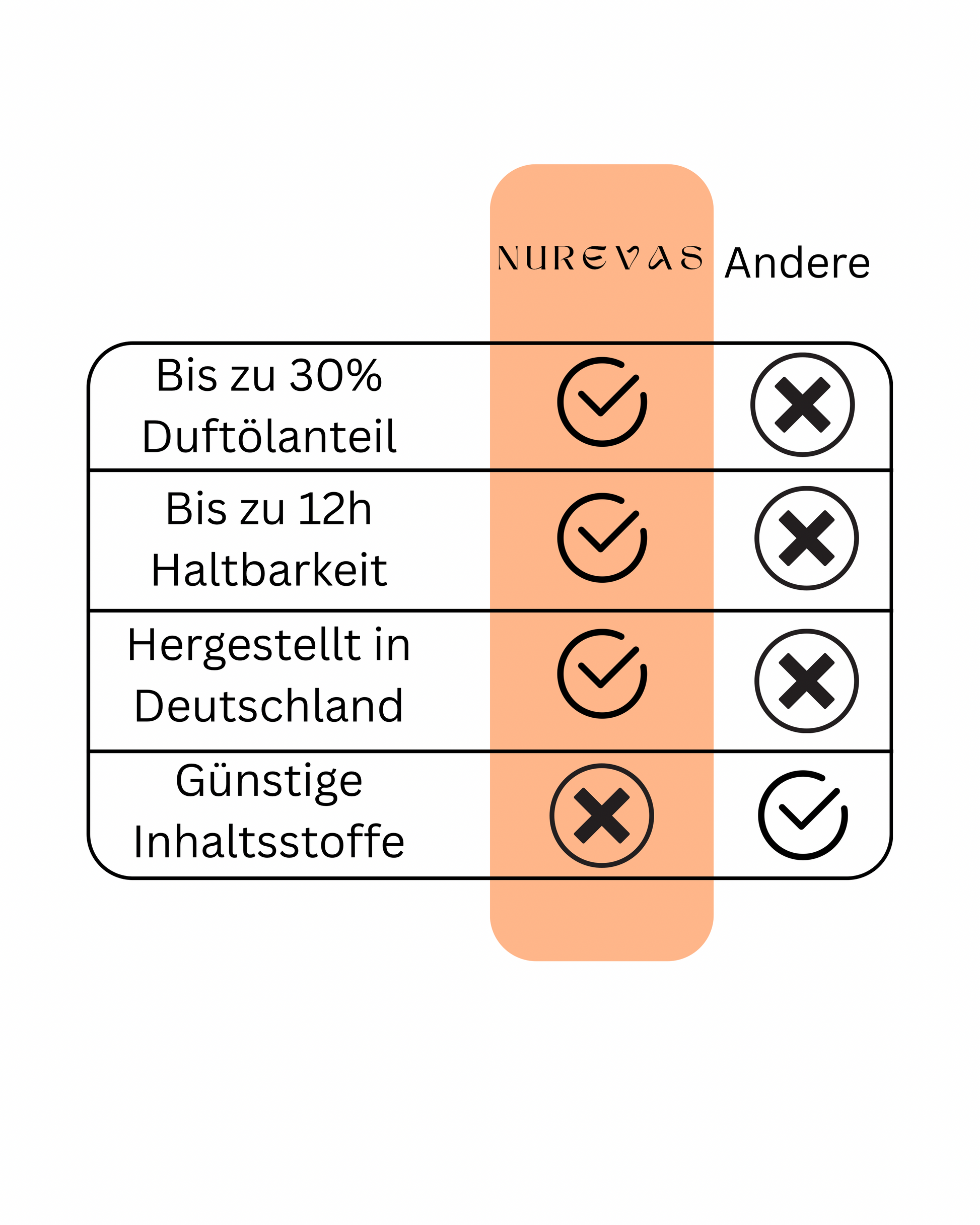 Nureva garantiert höchste Qualität und Sicherheit. Alle Parfums erfüllen die IFRA-Standards und die EU-Kosmetikrichtlinien, sodass du bezaubernde Düfte genießen kannst, die höchsten Sicherheitsstandards entsprechen.